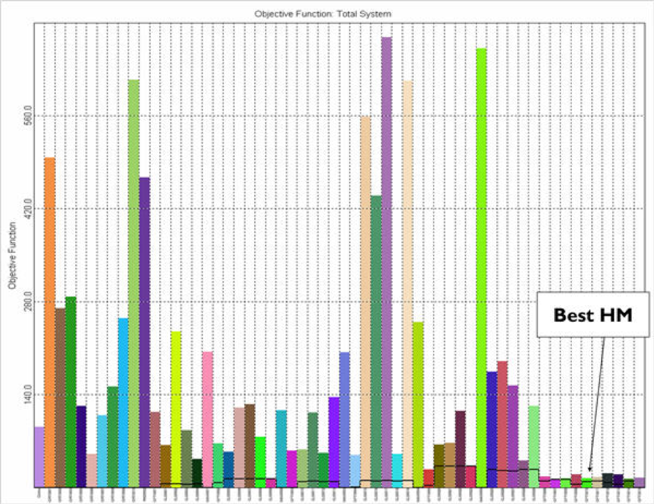 Each of these solutions will have different HM parameter values, but the objective function value will be very similar indicating an equally acceptable solution.